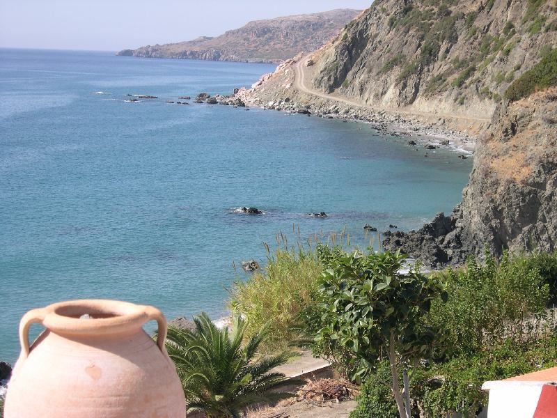 All’esterno di questa area c’è una terrazza con una scalinata in legno che conduce giù all’area giardino, c’è inoltre un bagno con vasca e lavatrice. La casa è dotata di aria condizionata in entrambe le camere. Al primo piano c’è una camera matrimoniale e una camera con due letti separati con una terrazza comune da cui si gode uno splendido panorama con vista mare, spiaggia di Triopetra e  lago di Preveli.